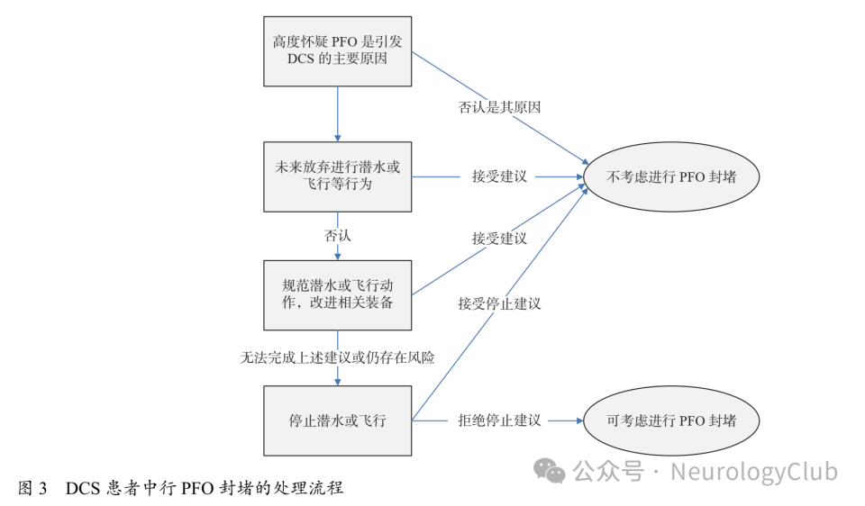 总之,DCS被认为是潜水员最常见的疾病之一。虽然近期的研究让PFO在其病理生理学中的作用得到了更好的解释。但对于存在PFO潜水员的日常医疗保健,无论是选择保守治疗还是PFO介入治疗,都应基于医学专家、潜水专家和患者本人共同的决策。未来也需组织更大的随机对照临床研究,以阐明DCS的最佳预防和治疗方法。对于DCS患者的PFO应对流程见图3。