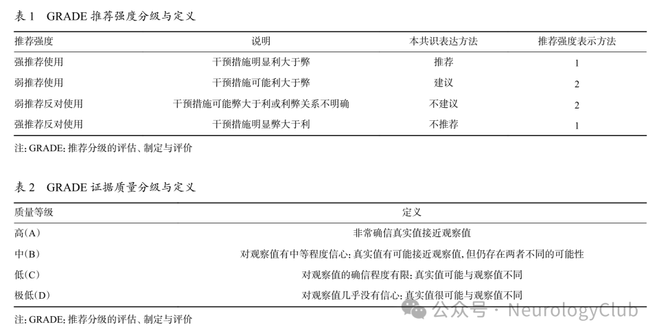 本共识涉及的疾病除偏头痛外,多数为临床上发病率偏低、患者群体较小的疾病,同时目前针对PFO-NAD的临床研究尤其是高质量随机对照临床研究较少。本共识证据和推荐意见的评价方法采用推荐分级的评估、制定与评价(Grading of Recommendations Assessment,Development and Evaluation,GRADE)分级系统,见表1和表2。